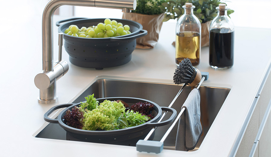 Aus nass mach trocken. Smarte Lösungen für bestens bekannte Alltagsprobleme und clevere Produkte für das Abtropfen und Trocknen rund um die Spüle. Von frisch gespülten Flaschen über feuchte Lappen und Bürsten bis zum gewaschenen Salat.